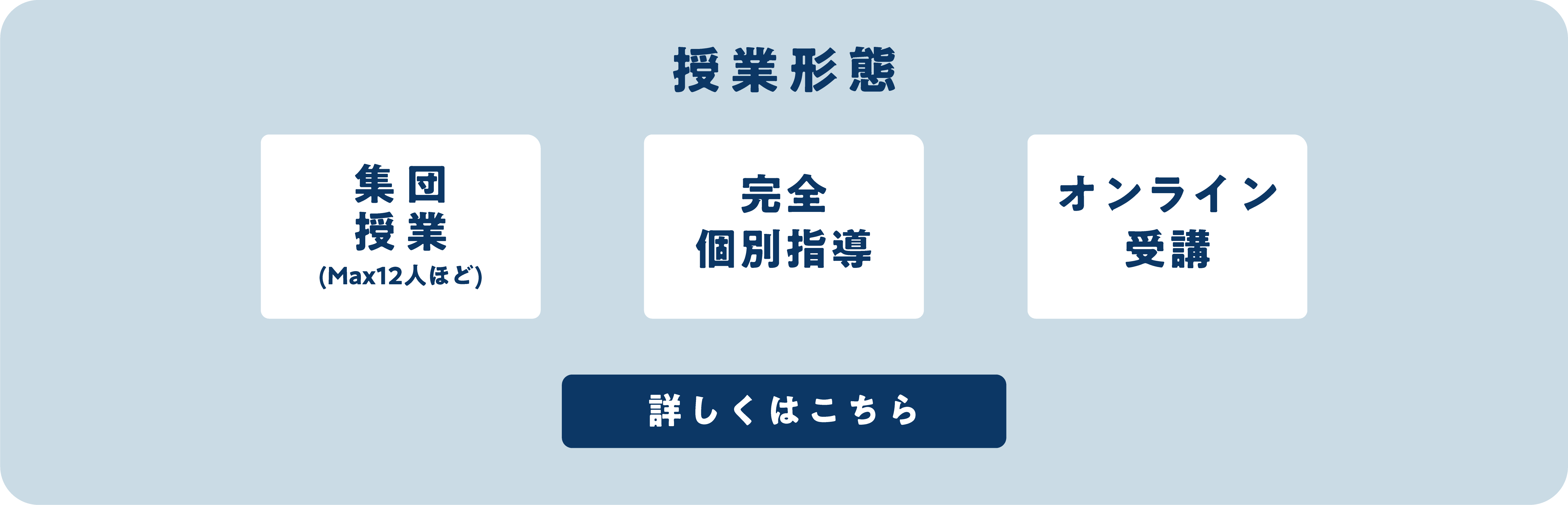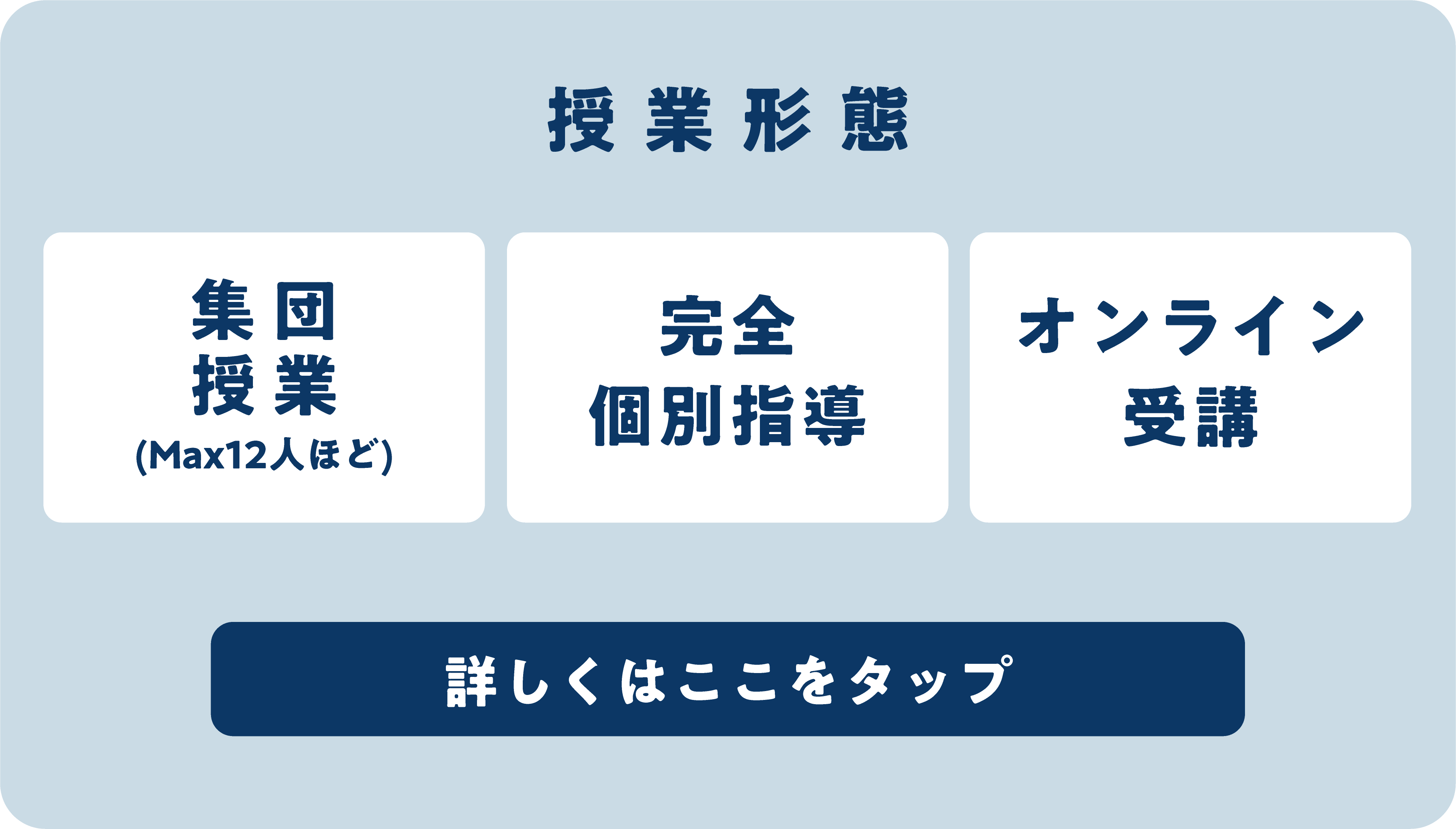 授業形態は『集団授業(Max12人ほど)』『完全個別指導』『オンライン受講』から選択が可能です。